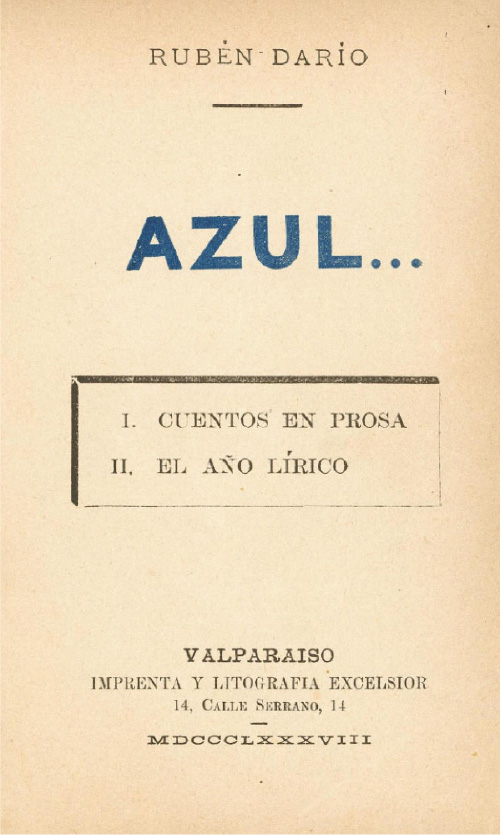 Precisamente Azul es la obra con la que inicia el Modernismo y se aleja de la influencia hispana. Es un libro de cuentos y poemas que fueron escritos en Chile. Toma elementos del parnasianismo y simbolismo francés, por lo que presenta un Modernismo más afrancesado y preciosista. Presenta gran cuidado de sonoridad verbal y pasajes líricos subjetivos.