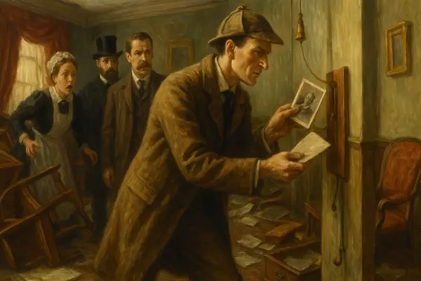 Holmes pasó junto a la sirvienta y se precipitó en la sala, seguido por el rey y por mí. El mobiliario estaba esparcido en todas direcciones, con estanterías desmontadas y cajones abiertos, como si la señora los hubiera vaciado a toda prisa antes de escapar. Holmes corrió hacia el cordón de la campanilla, arrancó una tablilla corrediza y, metiendo la mano, sacó una fotografía y una carta.